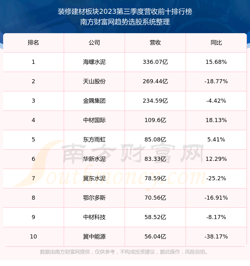 按照趋势选股系统统计,该股所属板块为装修建材板块,该板块共有68只股票,亚士创能2023第三季度营收在该板块中排名为第38名,该板块2023第三季度营收排名前十的股票如下表: