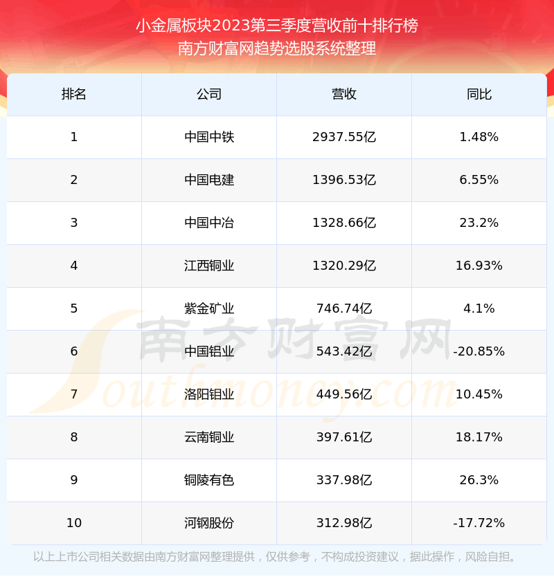 按照趋势选股系统统计,该股所属板块为小金属板块,该板块共有158只股票,贵研铂业2023第三季度营收在该板块中排名为第21名,该板块2023第三季度营收排名前十的股票如下表: