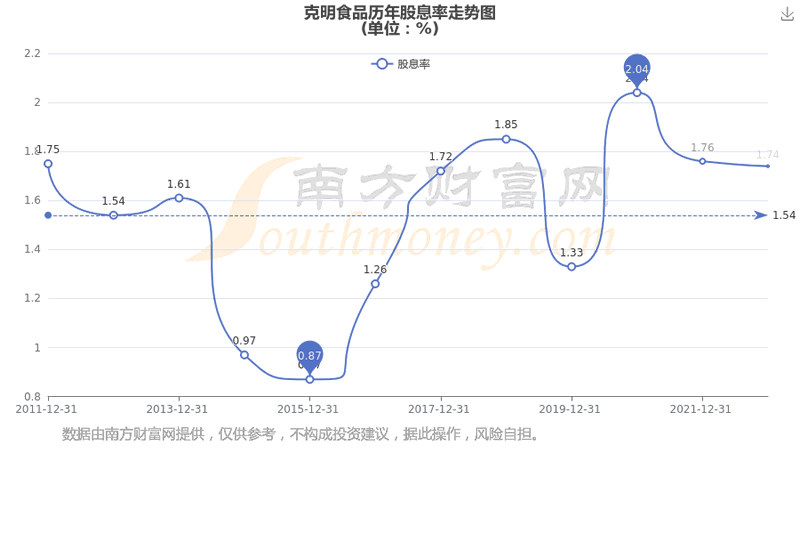 克明食品最新一次公布的分红方案为10派2元。本次权益分派股权登记日为2023年6月2日,除权除息日为2023年6月5日,派息日为2023年6月5日。