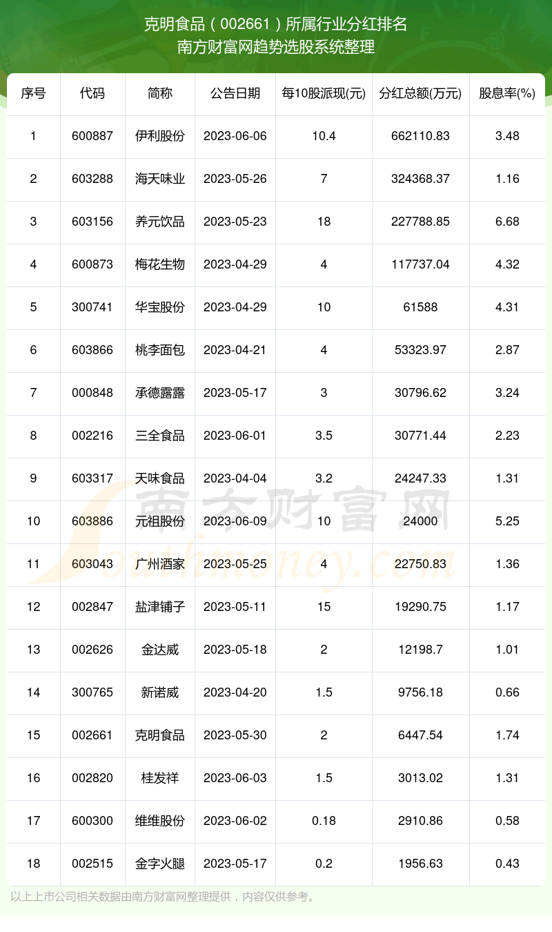 按照趋势选股系统统计,克明食品所属行业为面条行业,面条行业分红排名情况如下表: