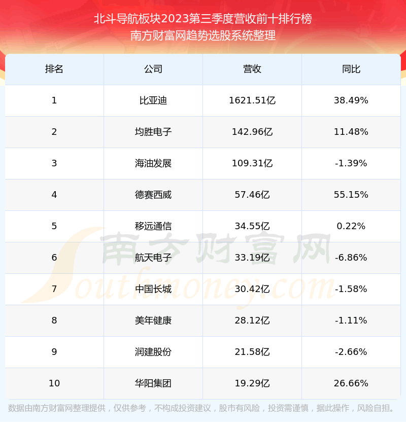 按照趋势选股系统统计,该股所属板块为北斗导航板块,该板块共有112只股票,长江通信2023第三季度营收在该板块中排名为第111名,该板块2023第三季度营收排名前十的股票如下表: