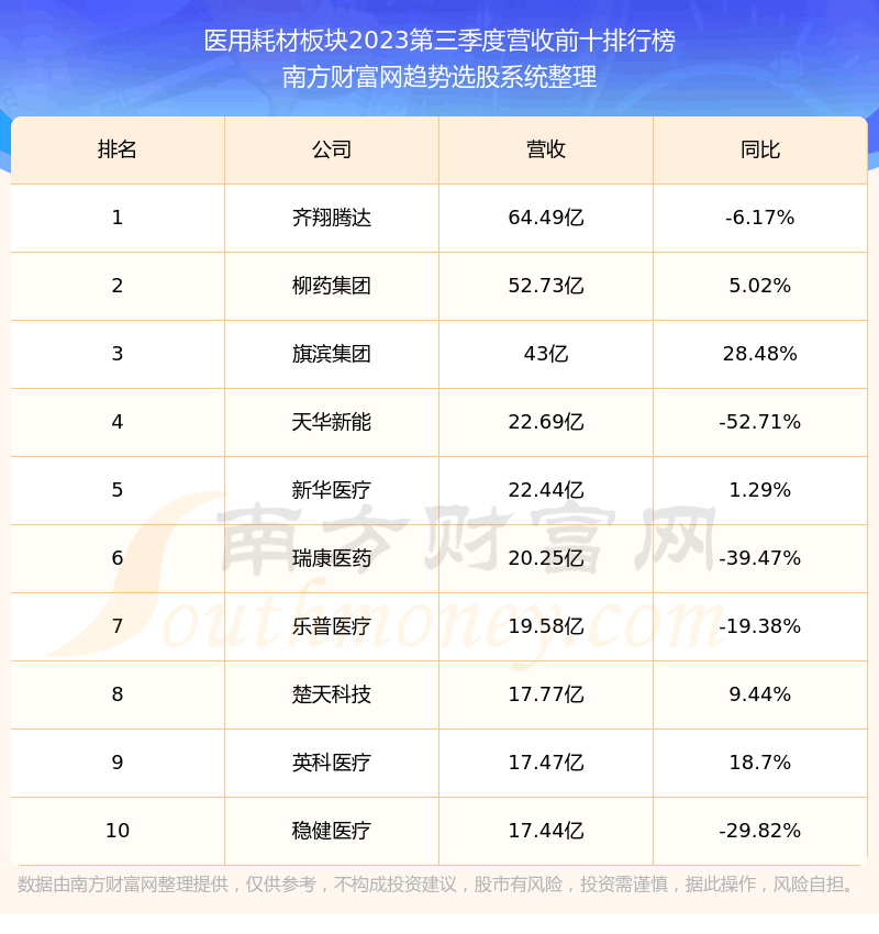 按照趋势选股系统统计,该股所属板块为医用耗材板块,该板块共有97只股票,迈得医疗2023第三季度营收在该板块中排名为第72名,该板块2023第三季度营收排名前十的股票如下表: