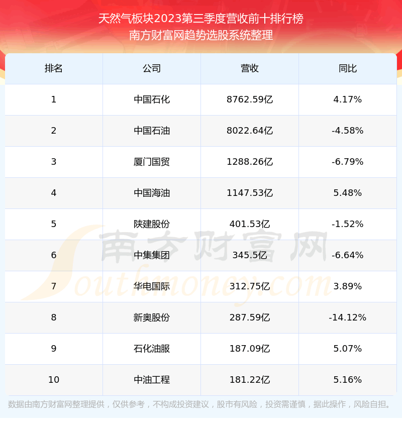 按照趋势选股系统统计,该股所属板块为天然气板块,该板块共有158只股票,中油工程2023第三季度营收在该板块中排名为第10名,该板块2023第三季度营收排名前十的股票如下表: