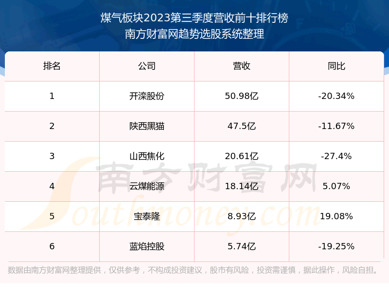 按照趋势选股系统统计,该股所属板块为煤气板块,该板块共有6只股票,云煤能源2023第三季度营收在该板块中排名为第4名,该板块2023第三季度营收排名前十的股票如下表: