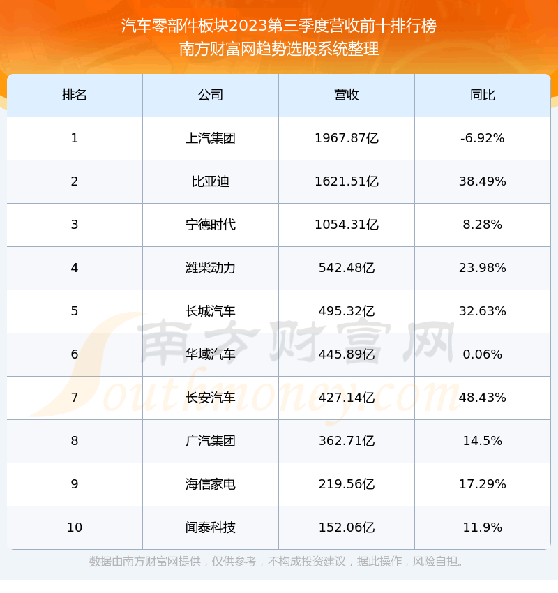 按照趋势选股系统统计,该股所属板块为汽车零部件板块,该板块共有468只股票,华懋科技2023第三季度营收在该板块中排名为第238名,该板块2023第三季度营收排名前十的股票如下表: