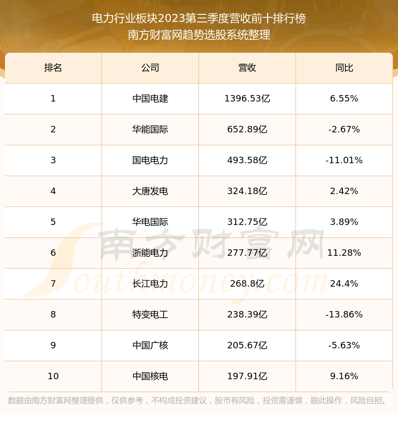 按照趋势选股系统统计,该股所属板块为电力行业板块,该板块共有93只股票,内蒙华电2023第三季度营收在该板块中排名为第24名,该板块2023第三季度营收排名前十的股票如下表: