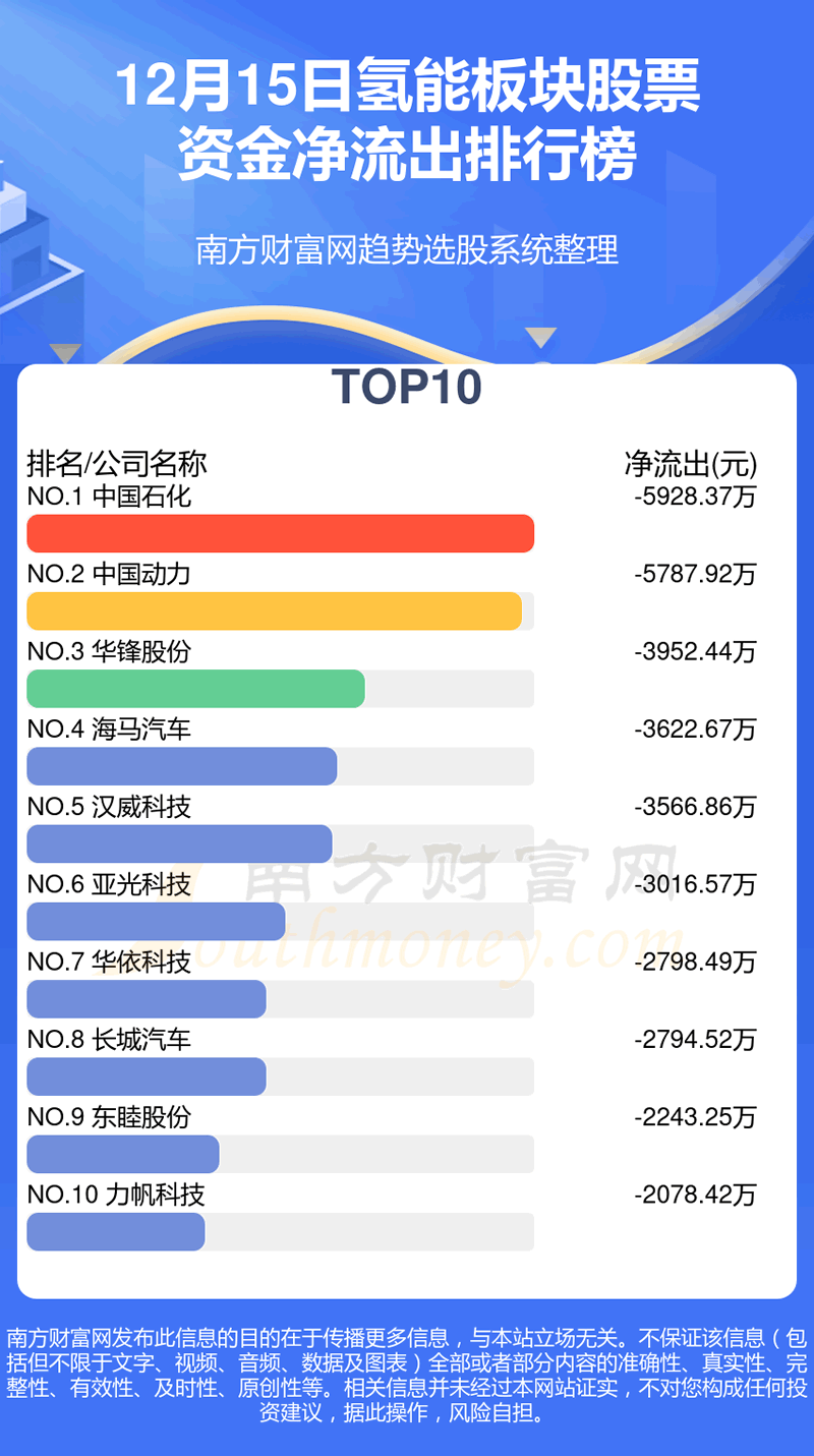 氢能板块股票12月15日资金净流出情况来看,中国石化位列第一位,主力净流出达到-5928.37万元;中国动力排名第二,主力净流出为-5787.92万元;华锋股份排名第三,主力净流出-3952.44万元。主力净流出排名前10的还有:海马汽车、汉威科技、亚光科技、华依科技、长城汽车、东睦股份、力帆科技。