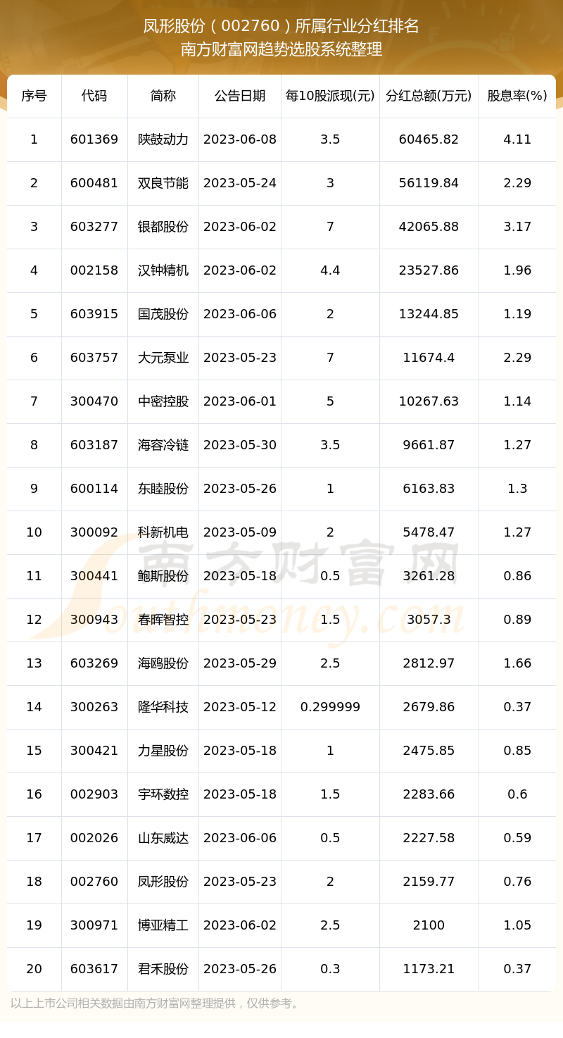 按照趋势选股系统统计,凤形股份所属行业为通用设备行业,通用设备行业分红排名情况如下表: