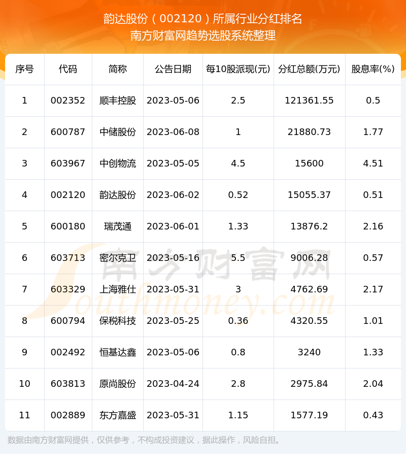 按照趋势选股系统统计,韵达股份所属行业为物流行业行业,物流行业行业分红排名情况如下表: