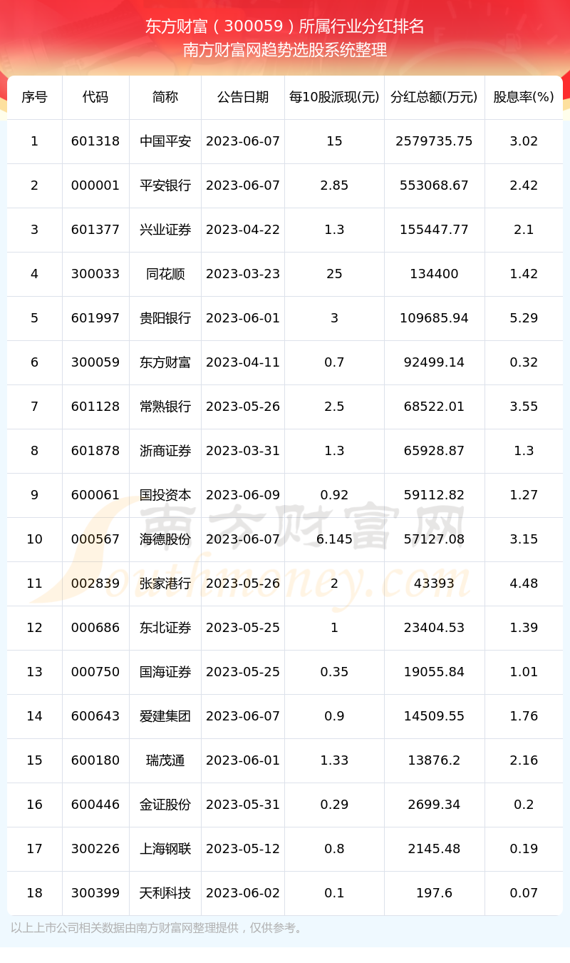 按照趋势选股系统统计,东方财富所属行业为互联网服务行业,互联网服务行业分红排名情况如下表: