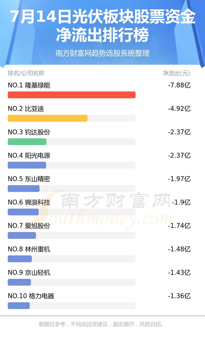 光伏板块股票7月14日资金净流出情况来看,隆基绿能位列第一位,主力净流出达到-7.88亿元;比亚迪排名第二,主力净流出为-4.92亿元;钧达股份排名第三,主力净流出-2.37亿元。主力净流出排名前10的还有:阳光电源、东山精密、锦浪科技、爱旭股份、林州重机、京山轻机、格力电器。